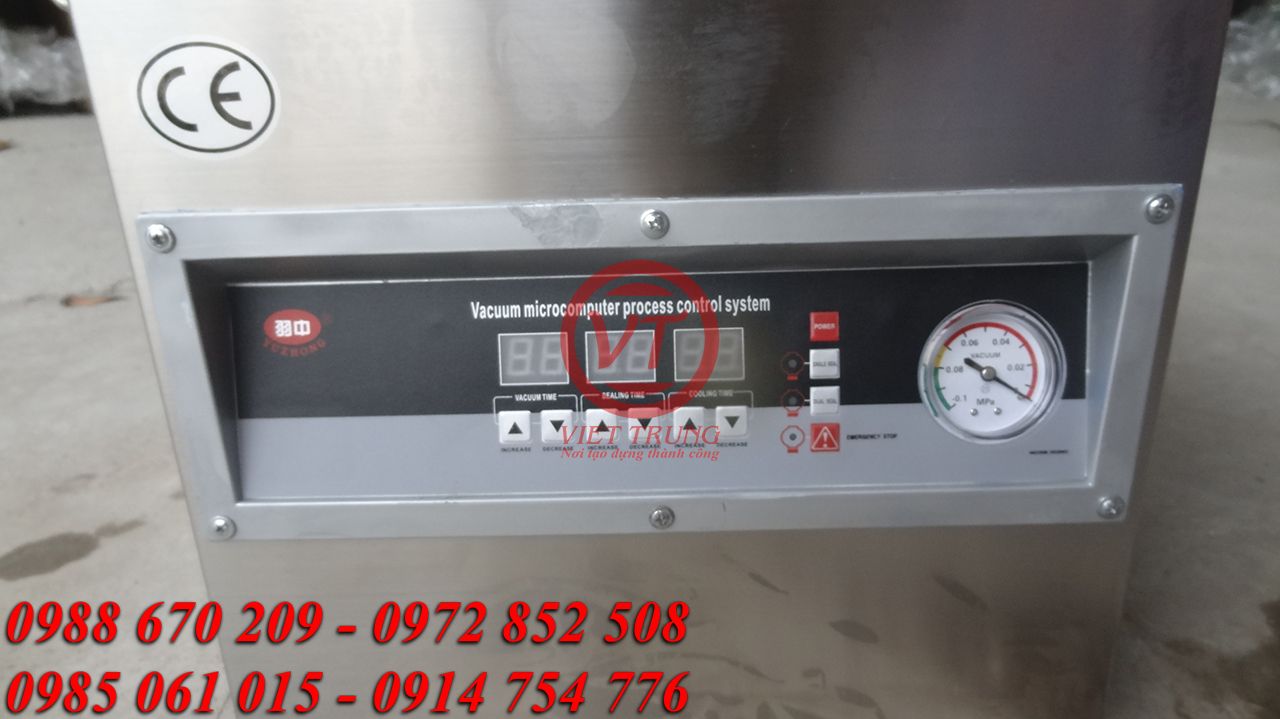 1. Bảng điều khiển trung tâm: các nút điều chỉnh điện tử để lập trình các công đoạn đóng gói, đồng hồ đo áp suất chân không, màn hình LED kỹ thuật số thể hiện các thông số thời gian hút chân không, thời gian hàn miệng túi.